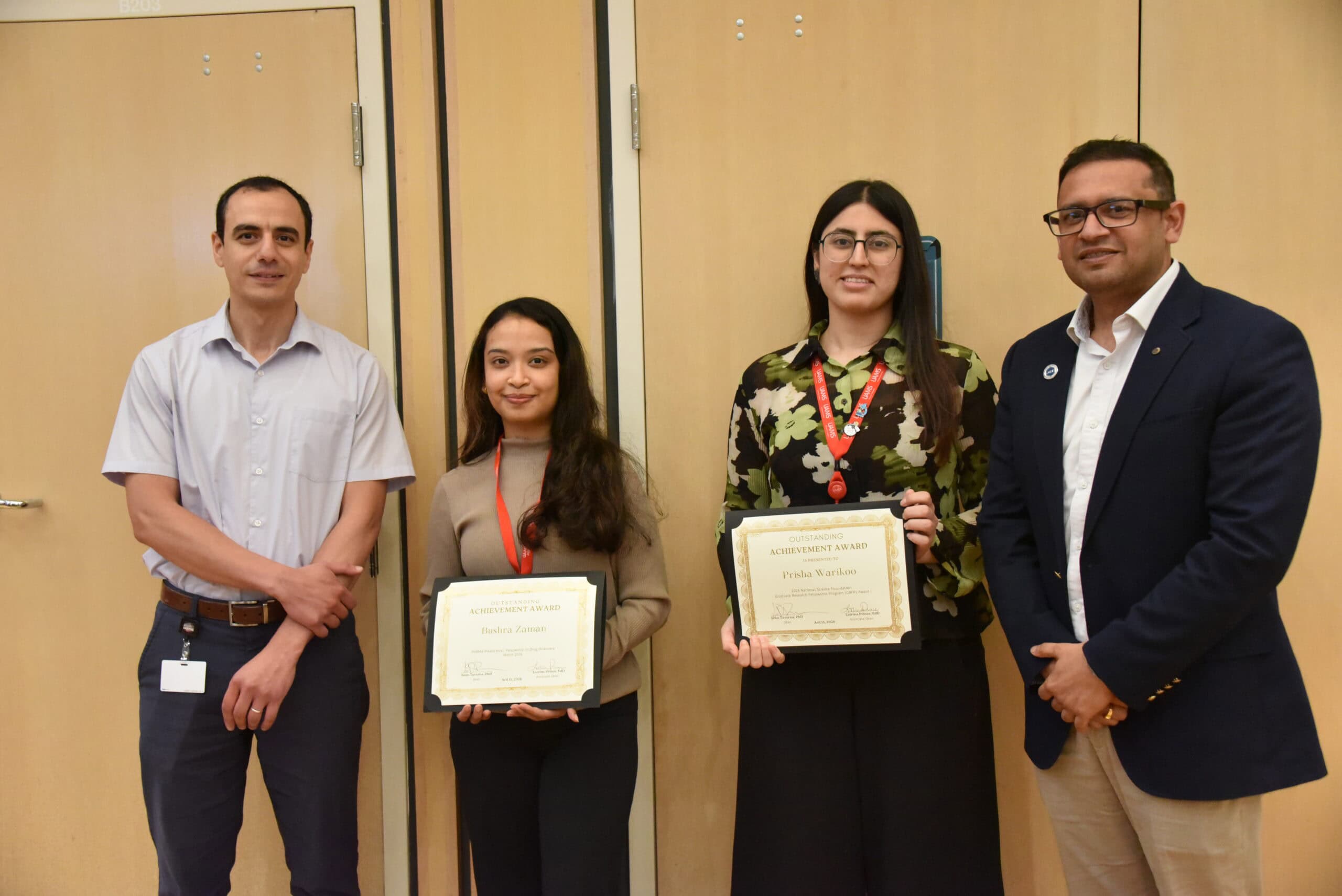Students Prisha Warikoo and Bushra Zaman received Outstanding Achievement Awards. Warikoo was recognized for receiving a National Science Foundation Graduate Research Fellowship Program Award. Zaman was noted for her award of a PhRMA Foundation Drug Discovery Predoctoral Fellowship.